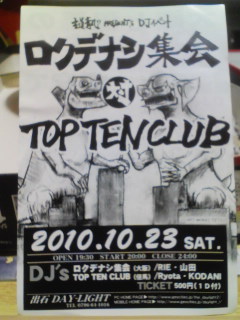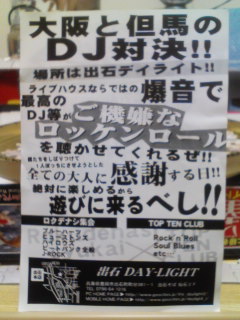 今週末23日ですよ!! 『ロクデナシ集会』対『TOP TEN CLUB』 大阪と但馬のDJ対決!! 場所は出石デイライト!! ライブハウスならではの爆音で最高のDJ等がご機嫌なロッケンロールを聴かせてくれるぜ!! 僕たちをしばりつけて1人ぼっちにさせようとした全ての大人に感謝する日!! 絶対に楽しめるから遊びに来るべし!! 『ロクデナシ集会』 ブルーハーツ ヒューストンズ ハイロウズ ビートパンク全般 J-ROCK 『TOP TEN CLUB』 Rock'n'Roll Soul Blues etc… 音道青心PRESENTS 10月23日 オープン 19:30 スタート 20:00 チケット \500(1D付) DJ 『ロクデナシ集会』 RIE 山田 『TOP TEN CLUB』 Ryota KODANI 場所 出石デイライト (問) 0796-64-1016 皆さん是非是非遊びに来て下さいよ ![]() | カレンダー